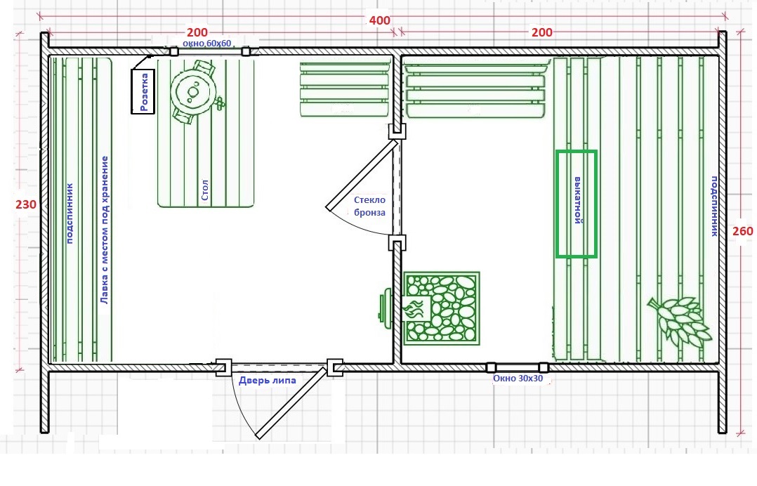 - Двери Парилка: каркасная-Липа или Стекло Бронза/Сатин